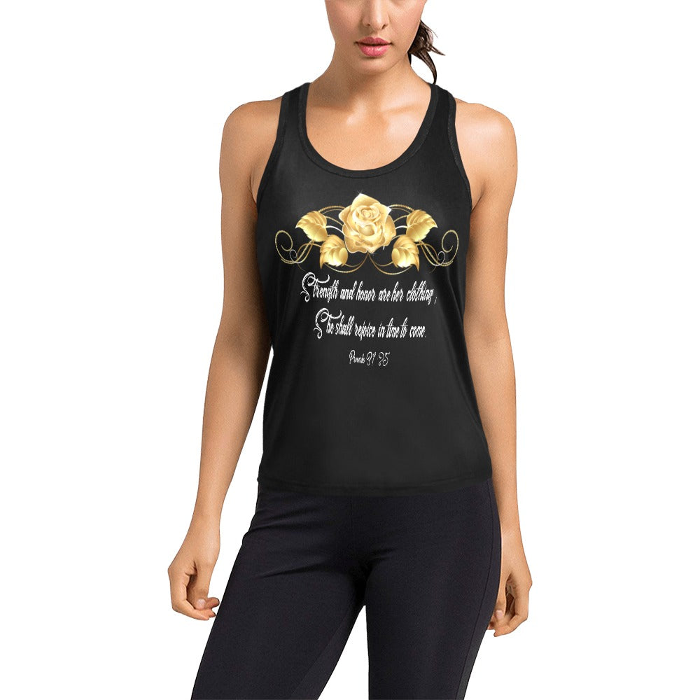 Strength and Honor are what define a woman, according to (BIBLE QUOTE). This women's racerback tank top features a biblical quote, making it more than just a fashion statement. It's a Christian woman's chosen way of life. This incredibly comfortable tank top is ideal for the active woman with its relaxed fit and casual style.